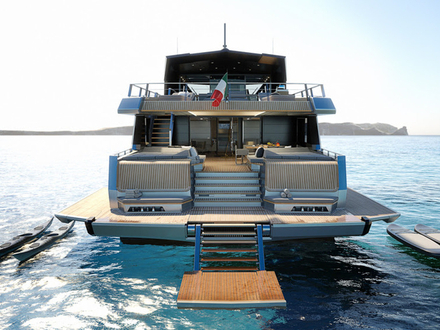 Des ailes rabattables agrandissent la zone du beach club pour atteindre une ampleur comparable à celle d'un superyacht, avec 32 m2 et un accès à la mer sur trois côtés, créant un tout nouveau niveau de plaisir à la ligne de flottaison. Avec non pas un mais deux garages dissimulés, la capacité de stockage est sans précédent pour la catégorie de taille du yacht, avec un rangement ingénieux d'une annexe de quatre mètres et de nombreux jouets aquatiques.