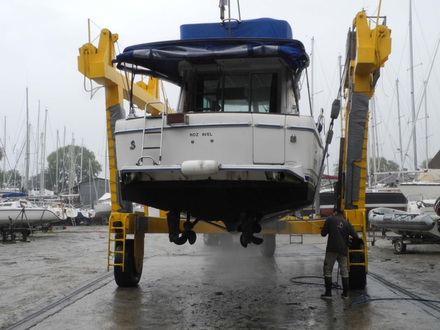 Le modèle retenu sur ce bateau a été un modèle à vérin électrique Lenco. L’avantage de ce modèle est qu’il élimine le risque de fuite d’huile et délivre une puissance importante. Il n’existe pas de flaps en kit adaptables à toutes les coques de taille égale. Le choix doit être fait en fonction de la carène (planante, semi planante, à déplacement), du type de motorisation (hors-bord, z-Drive ou in-bord), du nombre et de la puissance des moteurs, de la longueur, du poids du bateau, de la vitesse, des caractéristiques du tableau arrière, etc. Un choix qui peut s’avérer difficile pour un non professionnel. Pour le faire, aux vues des données sur le bateau, l’importateur a conseillé le modèle TT12x18. Celui-ci conçu pour des bateaux de 8 à 12 m, délivre une force du vérin de 340 kg et est équipé de plaques de 460 x 305 mm. Pour la commande, une fois le type sélectionné, il ne reste plus qu’à définir le boitier de commande qui peut être standard avec simplement deux boutons ou équipé de LEDs. C’est ce dernier qui a été retenu pour des raisons pratiques d’utilisation. En effet, les LEDs indiquent la position des flaps et la remontée est automatique lors de l’arrêt de l’alimentation. Le dernier point à vérifier est la longueur de câble nécessaire entre le boîtier de commande et les vérins. En standard, 10 m de câble avec connecteurs précablés sont fournis. Au besoin, il existe des prolongateurs. Avec toutes ces données, il ne reste plus qu’à passer commande. Cette dernière vous sera livrée complète avec tous les accessoires de montage y compris les vis de fixation des pelles sur le tableau arrière et une notice de montage.