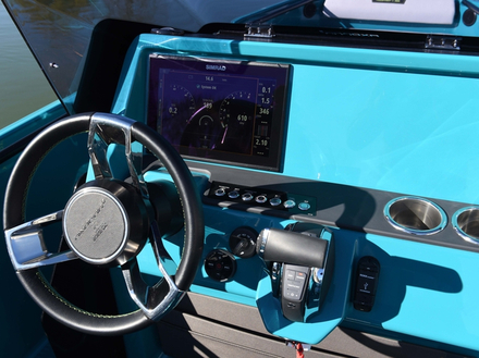 Le siège pilote se situe à bâbord et fait face à une console munie d’un grand écran SIMRAD 12’’ qui intègre tous les éléments souhaités pour un pilotage aisé, dont les paramètres moteur et navigation, avec une excellente vision pour la conduite. Le tableau électrique sobre est à portée de main et la commande électrique de gaz (uniquement sur les motorisations 175 cv & 200 cv) est très douce, et munie de l’option docking réduisant la puissance de 50% pour des manœuvres de port tout en douceur.