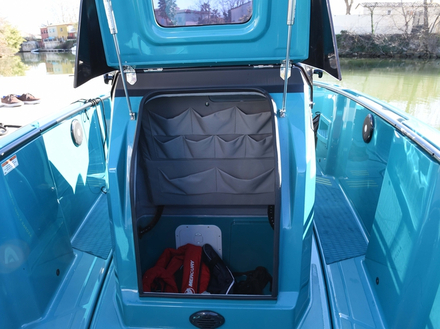 Un coffre en face avant de la console avec un capot qui se relève complètement au moyen de vérins, donne accès à un espace très grand dans lequel un toilette et un évier peuvent être installés (en option). A noter que le câblage électrique de l’instrumentation et commande de la console de pilotage sont totalement invisibles dans cet espace, reflétant une finition très soignée présente partout sur cette unité.