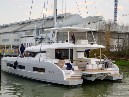 Dans le même esprit que les derniers modèles proposés, le Lagoon 55 voit l’emplanture de son mât très reculé, favorisant une répartition plus équitable des surfaces entre solent auto-vireur (74m2) et grand-voile (107m2). De profil la silhouette paraît presque élancée avec sa tête de mât culminant à plus de 29m de haut. Il n’en faudra pas moins pour déhaler les 26.5t lège de cette magnifique plate-forme de vie, qui en l’absence de vent pourra toujours recourir à ses deux moteurs Yanmar de 80CV, voire Nanni de 115CV en option. Officiellement le prix n’est pas encore fixé et les commandes pas encore ouvertes. Mais cela ne saurait tarder puisque le Lagoon 55 devrait faire ses grands débuts officiels du 28 Avril au 02 Mai à l’International Multihull Show de La Grande Motte avant d’entamer une tournée européenne tout l’été, puis de rejoindre les Etats-Unis et le salon d’Annapolis en Octobre.