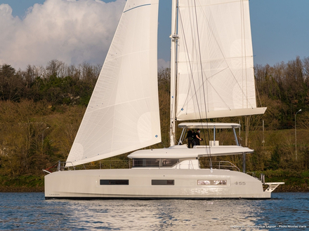 L’autre particularité à l’intérieur de ce nouveau 55 c’est... son ouverture sur l’extérieur ! Via sa baie vitrée extra large, la partie abritée de la nacelle se fond de plein pied avec le grand cockpit (25m2). L’absence de poutre arrière renforce encore l’impression de 'terrasse sur la mer’. La circulation à bord s’en trouve également facilitée et offre aux jupes de nouvelles perspectives, imaginées pour la première fois comme des espaces de vie à part entière. De même, la conception du cockpit avant a été particulièrement soignée. Intégré très tôt dans le processus de création, il se fond dans la ligne de pont et se fait aussi bien cocon intime, que lieu de convivialité à l’ombre de son taud amovible. A l’étage supérieur, c’est l’incontournable flybridge qui a vu sa surface augmentée par rapport à son prédécesseur. De quoi bien séparer les fonctions entre manœuvres et farniente, sans oublier la cuisine d’extérieur qui participera à l’agrément de ce lieu devenu centre névralgique des catamarans Lagoon.
