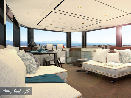 Pour Blu Emme Yachts, le chantier naval à l'origine de la marque Evo Yachts, le projet est une invitation à considérer la vie à bord comme un moment de convivialité et de détente, même lorsque l'on navigue à grande vitesse. Comme l'explique le designer, "les amateurs de yachts à moteur commencent leurs vacances lorsqu'ils atteignent leur destination, que ce soit au mouillage au large des côtes ou au port, alors que les propriétaires de voiliers commencent leurs vacances tout de suite, dès qu'ils montent à bord. Evo V8 combine la vitesse d'un yacht à moteur avec le confort et la détente de la voile".