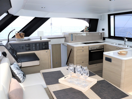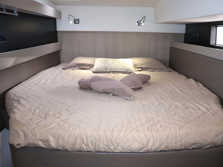 L’accès et la circulation à bord de l’Aventura 44 sont particulièrement aisés, à l’image de la passerelle arrière qui relie une coque à l’autre en arrière du grand cockpit. Des mains courantes sont toujours à portée pour sécuriser les déplacements vers l’avant. Aux grandes assises extérieures s’ajoutent plus protégés mais de plain-pied, une vaste cuisine en U et une table à cartes face à la route sur tribord, et un grand salon sur bâbord. Les hublots panoramiques offrent une très belle vision sur l’extérieur, ce qui est aussi agréable que sécurisant. La version standard propose d’un bord une longue suite propriétaire, et deux cabines de l’autre. Le bateaux dénote des productions orientées ‘charter’ par des choix plus orientés propriétaires et vie à bord à l’image des très nombreux rangements ou encore des toilettes séparés. Une version 4 cabines / 4 salles d’eau est bien sûr également disponible et retiendra certainement l’attention de quelques professionnels avertis.