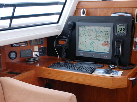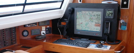 On peut aussi opter pour un PC portable (muni d’une alimentation 12 volts). Il est quand même conseillé de disposer d’un écran déporté, l’ordinateur étant (bien) calé sur la table à carte. Le clavier étanche et la souris trackball restent essentiels à l’usage.