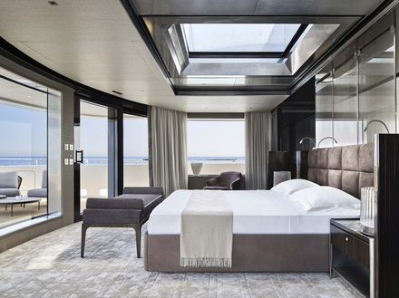 La visite commence par le vaste espace privé de la suite propriétaire de 215 m² sur le pont supérieur, qui non seulement jouit d'une incomparable vue panoramique à 180°, mais qui est également relié fonctionnellement à l'espace extérieur de 140 m² à l'avant, avec de grands bains de soleil et de détente et une piscine. Un pont entier à l'usage exclusif du propriétaire, accessible par un ascenseur, qui comprend non seulement la suite avec deux salles de bain et un dressing, mais aussi un bureau, un salon et, à l'arrière, le Sky Lounge de 67 m2, un espace réservé aux divertissements et aux jeux, complété à l'extérieur par une salle à manger en plein air qui garantit une vue panoramique pendant les repas "al fresco".