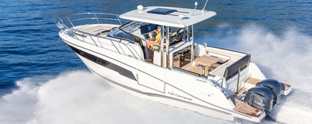 La ligne générale du Cap Camarat 10.5 WA Série 2 est proche du 12.5, de type Open Sport, et le T-Top (optionnel) renforce encore plus cette approche. L’intégration des hublots de coque dans le design des lignes est réussie.