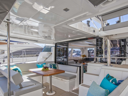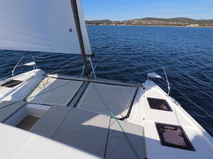 La brise est faible mais une fois les deux moteurs Yanmar de 45 CV éteints le Leopard 42 continue à avancer à 5 nœuds au près dans tout juste 10 nœuds de vent. Il faut dire qu’il n’a cédé ni à la mode du recul du mât ni à celle du solent auto-vireur. Une belle grand-voile à corne, un génois à recouvrement, un redan de coque à l’angle prononcé qui réduit la surface mouillée et un déplacement maîtrisé juste en dessous de 12.5 tonnes, ne le classent pas parmi les coureurs au large mais parmi les croiseurs vivants. Mais dans ce souffle léger il y a encore mieux pour sentir ce bateau vivre, un joli gennaker de 95m². Alors on prend la barre, ferme mais directe grâce à ses drosses, et on abat jusqu’au vent de travers. On sillonne alors la baie entre Saint-Aygulf et le rocher du Lion de Mer entre 6 et 7 nœuds. Mais si vraiment le vent vient à vous abandonner, vous pourrez toujours compter sur les hélices tripales pour rejoindre le mouillage le plus proche à 7,6 nœuds (vitesse de croisière à 2 300 tpm) voire 8,8 nœuds (vitesse max à 3100 tpm). Une fois à l’ancre, dont le chemin de chaîne sait se faire discret puisque le davier est en arrière du trampoline, en plus du lounge déjà évoqué, les espaces extérieurs ne manqueront pas pour profiter de tous les plaisirs sur l’eau : grande table de cockpit sur bâbord pour dîner « al fresco », méridienne sur tribord pour farniente, grandes jupes (1,60 m de large) pour se baigner et enfin immense bain de soleil avant pour bronzer.