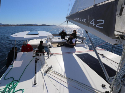 Nous aurions aimé essayer le bateau dans des conditions plus musclées, une mer plus formée, pour valider notamment une hauteur sous nacelle mesurée à un petit 62 cm à l’aplomb de la poutre arrière. A défaut nous rentrons au port apprécier les deux prises de quai disponibles en série, une à l’arrière de chaque coque et essayer le bossoir basculant sur treuil électrique capable de soulever 200 kg, sans vraiment de limite de longueur pour l’annexe qui est en arrière des jupes. Dès l’extérieur, qu’il s’appelle Leopard pour les clients privés ou Moorings dans les flottes de location, ce 42 pieds nous surprend plus qu’agréablement. Si l’intérieur fait aussi forte impression que l’extérieur, comme le ramage se rapporte au plumage, il justifiera pleinement que 50 exemplaires aient été déjà commandés dans le monde alors qu’il n’a encore été présenté officiellement qu’aux Etats-Unis. Alors rendez-vous jeudi dans Figaro Nautisme pour découvrir des aménagements… qui ont tout d’un grand !