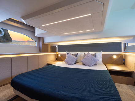 La cabine avant, pour les invités, est constituée d’un grand lit double centré, avec des passages de chaque bord. Des hublots de coque agrandit les espaces et font pénétrer la lumière. La salle de bain attenante a pour particularité de pouvoir être partagée avec des invités de passage par une solution à double porte, très pratique dans un usage à la navigation à la journée.