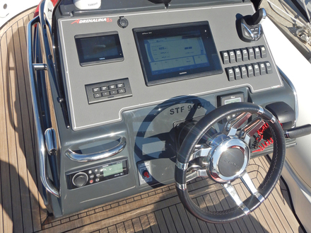 À gauche de la console se trouve l’écran tactile Yamaha CL7 qui donne accès aux différents programmes de pilotage du moteur, ainsi que les multiples fonctionnalités de la commande électrique, du trim automatique, etc… Sous cet écran, le pupitre de commande du pilote automatique Yamaha, trouve sa place.La barre, réglable en hauteur, est à sensibilité et démultiplication variables, qui se modifient selon les paramètres programmés en mode manœuvre ou conduite, astucieux et très fonctionnel. La commande du guindeau (localisée à droite de la barre) s’effectue au moyen d’un pupitre digital affichant également un totalisateur de chaîne. La commande des gaz se situe à droite, aux côtés des commandes marche / arrêt du moteur (et disposant d’un boîtier anti-démarrage).