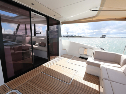 Il va falloir s’y habituer, offrant beaucoup plus d’espace à longueur égale que les monocoques, pour des comparaisons plus équitables, Fountaine Pajot a renommé l’intégralité de sa gamme Motoryacht. Le 40’ est désormais nommé MY5 car il offre le volume d’un monocoque de 50 à 55 pieds, et le 44 devient MY6. Aussi, fort logiquement, ce tout nouveau MY4.S fait-il 36 pieds soit précisément 11 mètres. Quant au S de la dénomination, il illustre le choix d’un roof "Sport Top", sans flybridge. La ligne du bateau s’en trouve bien sûr affinée, plus sportive que celle de son prédécesseur, plus proche en style des plus beaux monocoques. Mais avec ses 5,10 m de large il est vrai qu’il offre un espace à vivre bien plus imposant. En posant le pied sur le pont on trouve même le cockpit un peu vide, en dehors de la longue banquette arrière, avant que l’on ne nous montre la modularité de cette dernière, qui permet de la transformer en un clin d’œil en bain de soleil. Une fonction qui occupe également toute la plage avant, sur près de 5m². On y accède par des passavants sécurisants, entre main courante sur le roof et garde-corps rigide côté bordé.