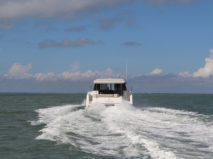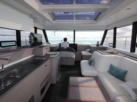 Lors de ce premier tour d’horizon, on est tout de suite frappé par la transparence du roof. Des vitrages peu teintés, de fins montants verticaux, le toit du roof, qui fait également office de pare-soleil évitant l’effet de serre, paraît comme en lévitation. Une impression immédiatement confirmée depuis l’intérieur où la lumière entre à flot, que ce soit par les vitrages latéraux ou par le toit ouvrant vitré "Skylight", une option dont il serait vraiment dommage de se passer. Surtout, on se sent dans cet intérieur aux finitions cossues, et grâce à une vue panoramique à 360°, en totale immersion dans l’environnement marin. C’est plus qu’agréable, que l’on se trouve en cuisine sur bâbord, dans le carré sur tribord, ou sur l’un des deux sièges du poste de navigation tout à l’avant. Dans ce dernier cas, l’excellente visibilité est également un facteur de sécurité, car en dehors de deux petits angles morts à l’arrière, la vision périphérique sur le plan d’eau est juste parfaite.