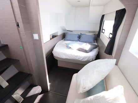 Un confort de mouvement qui bénéficiera à la qualité de vie à bord. Les aménagements, signés Pierangelo Andreani se déclinent en trois ou quatre cabines, mais toujours avec un niveau de finition élevé. La qualité perçue a fait l’objet d’un soin particulier et cela se voit partout. Sellerie confortable, vaigrages saillants, boiseries parfaitement ajustées, rangements pratiques et nombreux dans la cuisine, hauteur de vitrage (80 à 90 cm) séduisant, la nacelle est des plus accueillantes. C’est peut-être dans la coque tribord que la longueur de (seulement) 36 pieds est la plus limitante. Si la cabine arrière est de très belles dimensions avec son lit de 200 par 160, celle de l’avant paraît plus étriquée. Un cabinet de toilette partagé se loge au centre, une disposition qui se retrouvera à l’identique à bâbord sur la version 4 cabines. Mais l’appellation Maestro que nous avons essayé, propose une coque entièrement dédiée au propriétaire, isolée de la nacelle par une porte coulissante. La salle d’eau en suite inclue bien sûr une douche séparée. Le hublot de coque parallèle au lit de 200 x 160, offre une diagonale d’image de 135 cm, avec vue imprenable sur mer !