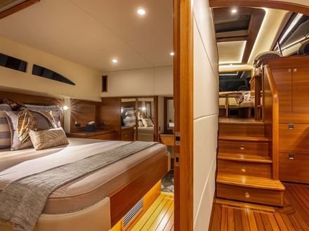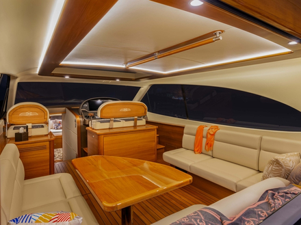 Le GT60 est doté d'un énorme pare-brise en verre incurvé d'une seule pièce, de grandes fenêtres latérales et arrière électriques dans le salon, et d'espaces de divertissement de plein pied dans le salon et le cockpit. Les aménagements sont pratiques et modernes, tout en conservant la véritable sensation nautique d'un yacht de croisière.