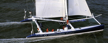 Le 31 janvier 1993, quelques heures après Peter Blake et Robin Knox-Johnston, les superbes coques bleu métallisé de Commodore Explorer quittent les quais de Brest. Malgré une météo peu favorable, un léger surpoids en ce début de parcours, des avaries de jeunesse et quelques erreurs tactiques, le premier tronçon entre Lizard et l’équateur est avalé dans un temps record : 8j et 19h. La descente vers les quarantièmes se fait en mode express, l’équipage n’hésitant pas à largement contourner l’anticyclone de Sainte Hélène pour rarement descendre en dessous de 20 nœuds de vitesse. A l’intérieur des deux coques monacales, les aménagements sont rudimentaires : 3 couchettes, une kitchenette d’un côté, deux couchettes et le bureau du patron de l’autre. Seules concessions au confort, un dessalinisateur pour produire un minimum d’eau douce et un chauffage à air pulsé de chaque bord pour sécher les vêtements. C’est toujours bon pour la performance ! A l’entrée dans la longue houle des quarantièmes les qualités de glisse du grand catamaran font merveille et le Cap de Bonne Espérance est doublé avec 3 jours d’avance sur le tableau de marche. Lamer se fait plus dure, il faut ménager le bateau. Aucun destrier aussi rapide ne s’est jamais aventuré dans ces contrées. Paradoxalement, les consignes au barreur sont de ne pas aller trop vite ! Une fois passés l’Australie et la Nouvelle-Zélande c’est le grand saut jusqu’au cap Horn. A 250 milles de ce cap mythique une tempête dantesque frappe le multicoque de plein fouet. Des vents à plus de 70 nœuds font craindre le pire. Mais après deux jours en fuite, enfermés dans les deux coques à communiquer entre eux par radio, Commodore Explorer ressort vivant et dans le bon sens de cet énorme coup dur, faisant irrémédiablement la preuve de ses immenses qualités marines.
