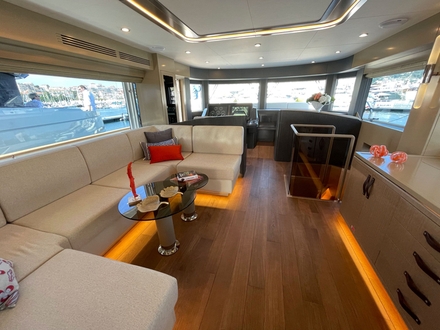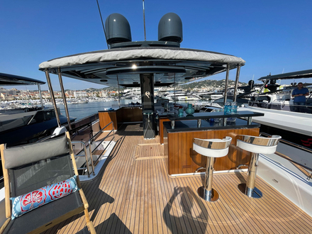 Sur le pont, la zone avant a été aménagée pour les bains de soleil et une vie détendue en mer. Une version fermée du vaste pont est également disponible pour les climats plus froids, avec un accès direct au salon principal en dessous.