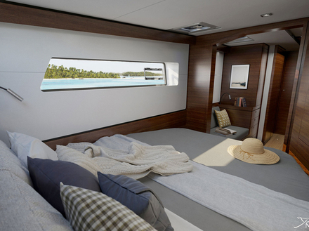 Pourtant, à la contrainte d’un calendrier serré, Gildas Le Masson n’a pas hésité à ajouter de nouvelles méthodes, en faisant notamment appel à un panel de 12 propriétaires et concessionnaires Nautitech pour définir leur catamaran « idéal ». Enthousiasmé par le fruit de leur travail il revendique même le « premier Nautitech conçu par les clients ». Nombre d’idées sont effectivement issues des ces groupes de travail. Il en va ainsi de la fameuse SmartRoom, un espace de rangement, à la fois technique et pratique, indispensable en grand voyage. Sur le fond, ces véritables ambassadeurs ont également bien pris soin que l’ADN de la marque soit conservé, voire sublimé. Le double poste de barre, revisité pour une meilleure ergonomie en équipage réduit, mais toujours présent à l’arrière, en atteste immédiatement. Mieux, l’expression de la sportivité inhérente aux catamarans Nautitech est renforcée par de nombreux éléments de design revus et corrigés, tels que les hublots de coque plus effilés que par le passé.