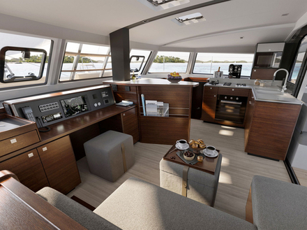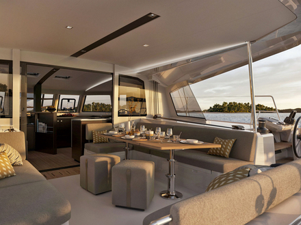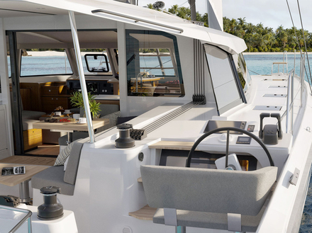 L’intérieur de ce futur cœur de gamme fait lui aussi sa petite révolution, puisque le chantier s’est adjoint pour la première fois les services de Christophe Chedal-Anglay. Auteur notamment des aménagements des mythiques Gunboat, le designer a intégré l’esprit de la gamme Open de Nautitech en s’efforçant d’abolir les frontières entre intérieur et extérieur. S’adressant à une clientèle de particuliers nomades et non plus de clients charter statiques, tous les lieux de vie ont été repensés à l’aune de cette nouvelle dynamique. Face à la route, disposant d’une très belle surface, la table à cartes est comparée à « un cockpit d’avion » par Maya Gautier, Directrice Marketing de Nautitech et véritable cheville ouvrière de ce projet. La cuisine et ses blocs de rangement occupent près de la moitié de la nacelle sous le roof, quand le vaste cockpit pouvant accueillir jusqu’à 8 convives, se pare de toiles latérales pour se la jouer ‘indoor’ le temps d’un grain tropical.