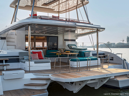 En trois décennies, le multicoque s’est imposé comme le support idéal des plus belles croisières. Il a aussi beaucoup changé et ce nouveau Lagoon 55 en est l’ultime évolution. En 1997, Marc Van Peteghem se souvient avoir dû s’employer à ce que le passage du cockpit au carré se fasse sans contorsions, malgré des contraintes de structure limitant la hauteur sous barrot de la porte. En 2021, cette frontière entre l’intérieur et l’extérieur est depuis longtemps abolie. Alors, c’est plus en arrière que les architectes ont innové, avec un cockpit complètement ouvert sur les jupes, véritable terrasse sur la mer. Seulement séparé de la plateforme hydraulique par des balcons inox. La sensation peut être surprenante par mer formée, elle est totalement séduisante par beau temps et bien sûr au mouillage. La circulation depuis ou vers les jupes, est facilitée par l’orientation à 45° des deux marches sur chaque bord. Cela pourrait paraître un détail par rapport à la traditionnelle montée axiale, c’est en réalité une vraie évolution ergonomique, rendant beaucoup plus naturel l’accès à bord. L’espace rendu disponible par cette petite révolution est utilisée sur bâbord pour accueillir une plancha et sur tribord un siège amovible. Aujourd’hui simple strapontin depuis lequel on s’imagine surveiller la ligne de pêche ou méditer sur un sillage éphémère, il ne serait pas surprenant qu’il gagne en confort sur de prochains modèles.