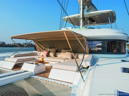 De retour en nacelle, deux nouveautés nous avaient échappé. Deux vitrages zénithaux de roof offrent un nouveau point de vue sur les voiles et le firmament. S’ils sont occultables pour éviter un excès de chaleur, ils sont surtout masqués par les bains de soleil avant du flybridge, ce qui explique notre oubli. Tout aussi discret mais tellement utile au mouillage, le vitrage central avant s’escamote vers le bas pour ventiler l’espace. Il ouvre sur un cockpit avant dont l’intégration a été si bien soignée qu’il mériterait lui aussi, comme l’arrière, l’appellation « terrasse sur la mer ». Qui plus est, deux options permettent de le protéger des rayons du soleil : soit un cabriolet repliable, soit une voile d’ombrage tendue entre le haut du roof et deux tubes carbone du plus bel effet. Si un doute subsistait encore sur l’évolution extraordinaire qu’a connu le monde du multicoque ces trente dernières années, le Lagoon 55 est le témoin de ce changement de dimension. Le soin apporté au design extérieur permet de faire passer le plus élégamment possible l’hyper-croissance des volumes. Ceux-ci permettent de proposer des aménagements intérieurs impossibles à imaginer sur un 17 mètres à la fin du siècle dernier. Traités, de plus, dans un esprit superyacht, ils permettent au Lagoon 55 d’établir un nouveau degré de référence en termes de qualité perçue dans sa catégorie.