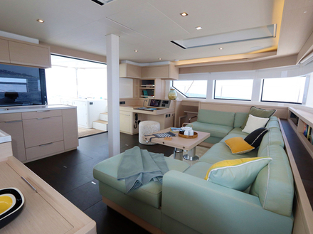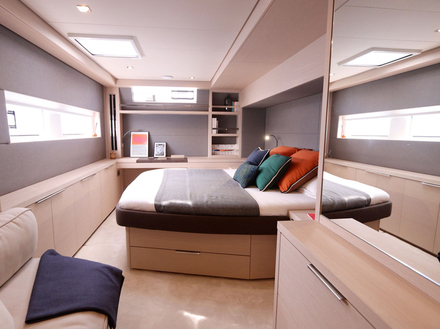 À défaut, cela restera toujours un immense plaisir de rejoindre l’intérieur. Hormis les quelques nuisances sonores inévitables sur un prototype (winch d’enrouleur de génois et grincements liés à des ajustements à parfaire) solutionnées sous peu, tout n’est que luxe et volupté. Les assises du carré sont dignes du lobby d’un grand hôtel et une véritable invitation à l’oisiveté. La cuisine en L à l’entrée sur tribord se prolonge d’un meuble bar des plus chics. Trois plans d’aménagement des cabines sont disponibles dont le quatre cabines avec Master Suite à l’arrière-tribord tel que proposé sur notre bateau d’essai. Des versions cinq et six cabines, avec autant de salles d’eau, sont également proposées afin de répondre à tous les usages, y compris les plus récents en plein développement comme la propriété partagée. Il faut souligner les nombreux rangements disponibles partout, la qualité des matériaux de vaigrage et le soin apporté à l’éclairage. Texture des cadres de lits, poignées de porte d’équipets et fargues de bibliothèque en inox, tout comme les ouïes de climatisation, Lagoon a soigné les finitions sur ce bateau forcément emblématique. Chaque détail compte et participe à donner une impression d’ensemble très haut de gamme. Les hublots de bordé ne sont pas les plus grands que nous ayons vus, mais ils sont à hauteur parfaite pour offrir une vue imprenable sur la mer.