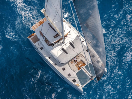 Pour cela, le « moteur » ne manque pas de chevaux, avec 186 m2 de voilure au près et 263 m2 sous code zéro. Plus abattu - les 272 m2 du très beau spi asymétrique bleu marine constellé d’étoiles sortis de leur chaussette -, le Lagoon 55 fait la preuve qu’il ne lui en faut pas beaucoup plus pour allonger la foulée. Alors que le vent oscille autour de 9 nœuds, les volumineuses étraves, savamment sculptées par Patrick Le Quément, fendent les eaux méditerranéennes à 6,6 nœuds. À 115-120° du vent réel. Au près, face à la houle typique des côtes catalanes, nous aurions envie que le triangle avant soit plus grand. Mais sans que le vent ait monté, le Lagoon 55 avance malgré tout à près de 5 nœuds à 40° du vent apparent, ce qui est fort honorable dans ces conditions. Alors que son tour d’Europe de démonstration est déjà bien lancé, l’équipage confirme : si au-dessous de 5 ou 6 nœuds de vent, les deux moteurs de 115 CV sont de parfaits alliés pour respecter le planning serré de cette tournée d’été, dès 10 nœuds de vent, le Lagoon 55 allonge la foulée et peut vite assurer des moyennes au-dessus de 8 nœuds sous voile.