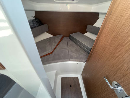 En tout, ce sont jusqu’à cinq passagers qui pourront passer la nuit à bord. On trouve ainsi deux couchages doubles, l’un en cabine et l’autre dans la timonerie, ainsi qu’un couchage supplémentaire qui pourra être aménagé dans l’ingénieux espace situé sous le carré.