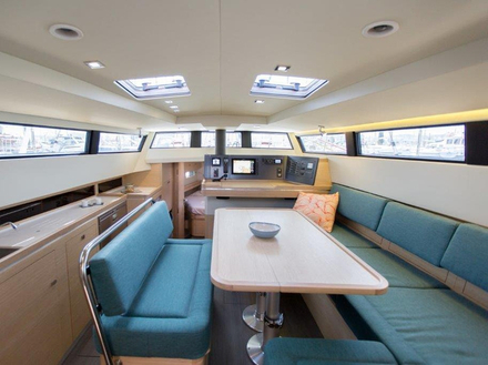 Le JPK 39 FC, pour Fast Cruiser, en offre plutôt moins à l’intérieur. Normal, sa priorité à lui c’est la performance. Avec seulement 5.5 t sur la balance et 82m² de voilure au près, son ratio mètre carré de voilure par tonne à déplacer est deux fois supérieur à celui de l’Ovni. Non, pour voir vraiment plus grand, il y a les deux frères ennemis, Boréal et Garcia. Toujours sur le même ponton le premier nommé présentait le Boréal 47.2 qui arbore le fameux dog-house emblématique de la marque. L’intérieur commence donc ici à l’extérieur, avec ce poste de veille à la vision panoramique si séduisante. Si cabine arrière, carré et cuisine ne paraissent pas immenses comparés à l’Ovni, la cabine avant se fait plus statutaire avec son island-bed. Un vrai poêle trouve place en avant de la cuisine pour les navigations les plus septentrionales, et une véritable soute à voile augmente considérablement la capacité d’emport. Pas très loin, le Garcia Exploration 45 développe derrière une impressionnante porte étanche, une autre géométrie de l’espace : la table à carte / poste de veille s’avance au pied du mât, quand cabine avant et cabine arrière disposent chacun de leur propre salle d’eau. Point commun des trois dériveurs intégraux : des cuisines en long, et donc un carré déporté intégrant le puit de dérive. Ainsi qu’un local technique qui permet d’accueillir tout le matériel nécessaire à un long voyage : sécurité, rechange, loisirs…