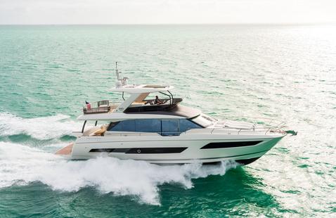 L’accès au salon intérieur du pont principal s’opère par une grande baie vitrée (à commande pneumatique), on pénètre alors dans un espace très sobre, la combinaison de larges lames de teak au sol et de vaigrages de couleur crème claire donnent une atmosphère chaleureuse et épurée. Le mobilier est moderne, et il est laissé à chaque armateur le choix de la décoration.