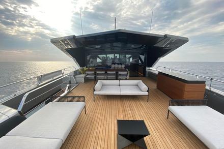 On accède par quatre marches centrales, très larges, au pont principal (main deck). Le deck extérieur à ce niveau dispose de deux très grandes plages de bain latérales, ceinturées par des assises pouvant accueillir aisément 8 à 10 invités.
