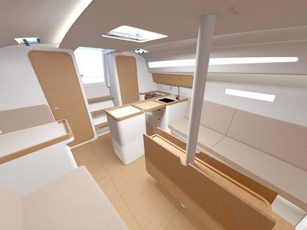 À contre-courant, le 36 dispose d’une grande table à cartes qui servira aussi de bureau du bord selon vos usages. Un minimum de deux hublots dans chaque cabine assure ventilation et lumière naturelle, tandis qu'un éclairage indirect illumine discrètement le bateau la nuit. Il peut passer en « lumière rouge » quand vous naviguez / régatez de nuit. Trois cabines avec des lits doubles facilement accessibles et un cabinet de toilette innovant complètent cet intérieur spacieux.