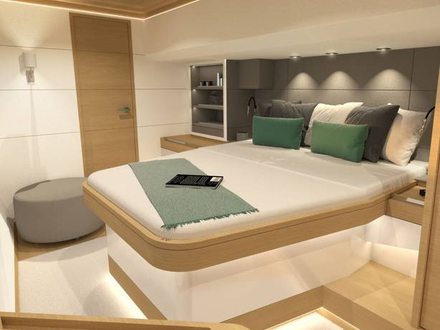 La suite propriétaires avec son lit en îlot transversal s’apparente au confort d’un plus grand yacht.