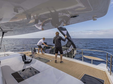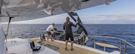 "Nous avons testé les performances du cerf-volant de 9 m² sur différents caps et à des angles de vent allant jusqu'à 40 degrés", explique Mike Wandler, capitaine de SILENT-YACHTS. "Contrairement à un voilier classique, les meilleurs résultats ont été obtenus directement sous le vent. Sous la puissance du kite, sans moteur ni hélice, la vitesse du bateau se situait entre 4 et 5 nœuds. Nous avons ensuite mis en marche les moteurs électriques en ne tirant que 1 kW chacun pour réduire la traînée des hélices et améliorer le flux d'eau sur les gouvernails pour une meilleure direction, ce qui a conduit à des vitesses de 6 à 7 nœuds sur les mêmes caps - une amélioration significative par rapport à nos prévisions initiales".
