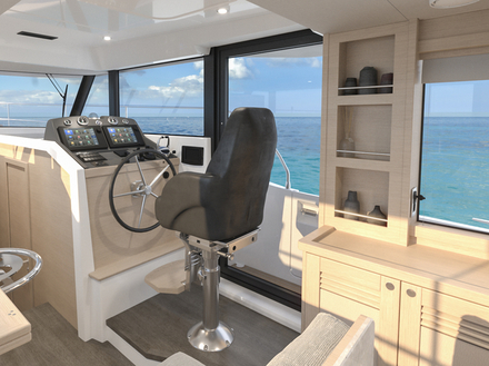 Le poste de pilotage comprend un siège pilote pivotant qui fait face à 2 écrans multifonctions Raymarine 12 pouces et à l’interface Ship Control Beneteau. En complément, une caméra arrière, des projecteurs de poupe et un joystick Cummins peuvent être ajoutés pour des accostages en toute sérénité. La finition gris anthracite du tableau de bord, de la console et du siège pilote et l’excellente visibilité créent un espace professionnel garant d’excellentes traversées en toutes conditions. La porte latérale adjacente offre un accès direct à la porte de coupée et au taquet central facilitant ainsi l’amarrage et la circulation.
