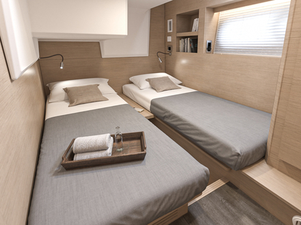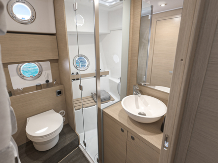 La cabine propriétaire avec grand lit double se trouve à l’avant du pont inférieur. Elle possède des coffres en hauteur, des penderies ainsi que des vitrages de coque panoramiques avec hublots ouvrants intégrés et un panneau de pont qui inondent la cabine de lumière naturelle et assurent une bonne ventilation. La salle d’eau attenante est équipée d’une cabine de douche séparée avec un siège en teck. La cabine invités à bâbord bénéficie d’un vitrage de coque panoramique, d’espaces de rangement, d’une penderie et de deux couchages individuels transformables en couchage double. Cette cabine a un accès direct à la salle d’eau bâbord, dans laquelle vous trouverez également une cabine de douche séparée. La cabine invités à tribord possède deux hublots, un couchage double transversal et une penderie double capable d’accueillir une machine à laver/sèche-linge.