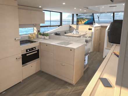 Une fois passée la porte coulissante, une grande cuisine en L se trouve à bâbord avec un réfrigérateur/congélateur de 255 litres et de grands rangements hauts. Dans la configuration standard la cuisine possède un four à gaz (four électrique multifonctions en option), un espace de rangement d’angle intelligent, des placards et des tiroirs qui garantissent une grande capacité de stockage pour les longues croisières, ainsi qu’un emplacement pour le lave- vaisselle optionnel. Le plan de travail en Corian est équipé d’une plaque de cuisson au gaz ou induction et d’un grand évier. Un spacieux buffet, avec des placards et un range-bouteilles fermé, fait face à la cuisine. Il peut être aménagé avec une machine à glaçon, un rangement pour service de table Villeroy & Boch ainsi qu’une armoire à verres éclairée au-dessus. Devant la cuisine et à proximité du poste de pilotage se trouve un carré en U surélevé avec vue panoramique pouvant accueillir aisément 8 personnes. L’extrémité de la banquette peut abriter une cave à vin et le meuble du plan de travail bâbord peut héberger une télévision 40’’.