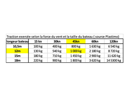 Pour un bateau de 13 mètres et 45 nœuds de vent établi rafales à 60, voici les tensions sur la ligne de mouillage :