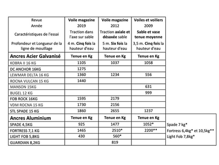 Ont volontairement été écartées, dans ce tableau, les ancres plates en acier galvanisé qui n’arrivent pas à rivaliser avec les moins talentueuses des ancres charrues