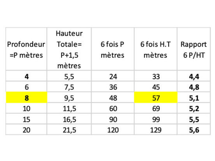 Par huit mètres de profondeur, en mouillant 48 mètres on est à 5.1 de la hauteur totale et donc réelle du point d’action de la ligne, il faut mouiller 57 mètres pour être à 6 fois la profondeur.