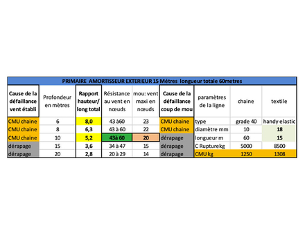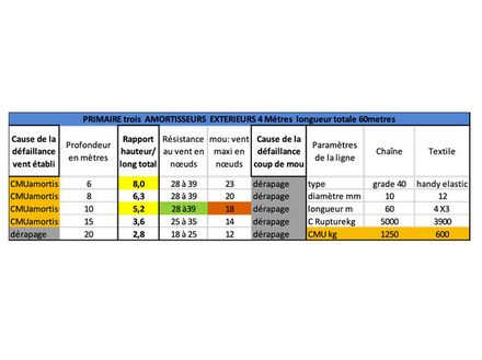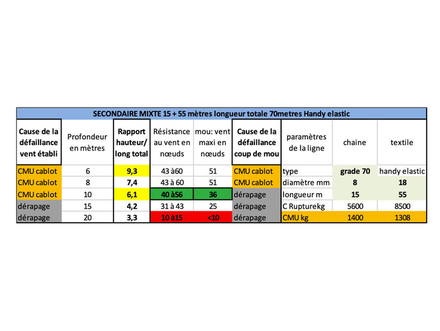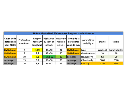 Sur ces tableaux sont notés, en fonction de la profondeur et de la hauteur totale =la profondeur +1.5 mètre : les vitesses de vent admissibles dans les conditions de vent moyen +40% , indiqué sous le terme « Resistance au vent en nœuds » et dans les conditions « coup de mou ». On précise sur ces tableaux quelles sont les causes de défaillance de la ligne : soit dépassement des limites mécaniques, soit dérapage par décrochage de l’ancre. A droite sont rappelés les paramètres techniques de la ligne.
