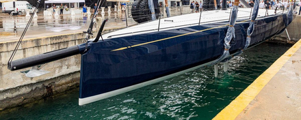 Alors pour perpétuer une recette gagnante, Giovanni Pomati, PDG du groupe Nautor, a réuni pour la version de 80 pieds les mêmes ingrédients. L’équipe de Juan Kouyoumdjian a dessiné une coque ne manquant pas de style avec notamment sa ligne d’étrave plongeante orné du liseré doré historique qui ne peut cacher toute sa puissance. Avec une largeur de 6 mètres et des flancs très verticaux, les bords de portant s’annoncent toniques quille de 4.75m basculée à fond. Avec autant de safrans que de barres à roue, deux, le barreur devrait pourtant pouvoir garder le contrôle de la bête en toutes circonstances, même s’il faudra du monde pour régler au millimètre les 447 m² de voilure au près, pour seulement 19 tonnes lèges. Une profonde dérive droite en avant de la quille assurera le cap au plus près du vent. Orientable, elle participera à la très grande maniabilité du bateau dans les phases tactiques les plus serrées. Le long bout-dehors est rétractable ce qui est assez surprenant sur un bateau de cette taille avec des gennakers et des spis aux surfaces idoines.