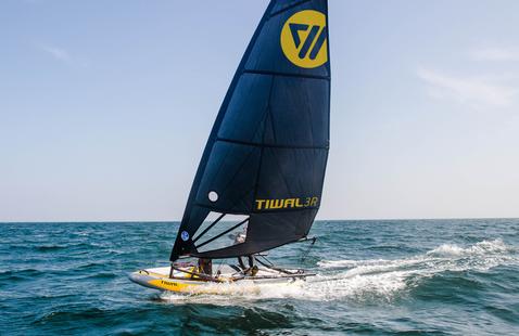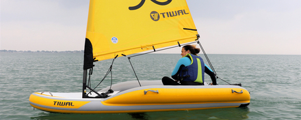 Mais avant de naviguer il faut assembler les 27 pièces détachées, toutes soigneusement protégées et emballées. Pas de stress, la notice est très bien faite et le montage, même pour une première fois, ne prend pas plus de vingt minutes. Un gonfleur électrique est le bienvenu, mais s’il n’est pas chargé comme lors de cet essai inaugural, la pompe manuelle double action fait très bien l’affaire, sans s’épuiser. Comme le T2 originel, le T2L a des ailes gonflables. C’est moins de montage, moins de risque d’abîmer le gelcoat du bateau quand on s’en sert au mouillage, plus confortable au rappel, moins impressionnant pour les débutants. Trois volumes sont donc à gonfler successivement. La coque centrale, qui demande le plus de pression (0,75 bars), pour assurer une bonne rigidité, et les deux ailes qui se contentent de 0,2 bars. Ne pas se laisser emporter par son élan : penser à insérer la structure alu centrale en cours d’exercice. C’est la clé du comportement de vrai bateau du Tiwal. Supportant le pied de mât, accueillant le puits de dérive, et des outriggers qui sont reliés à la coque par des sangles Velcro, cette pièce assure une rigidité vraiment intéressante. Le très grand soin apporté à sa fabrication, qui forcément participe au coût de l’ensemble, assure un assemblage parfait et une qualité de finition vraiment perceptible. Le support de safran, lui, peut être positionné en dernier. Une fois les manchons du mât carbone assemblés, on le fait entrer dans le fourreau de la voile et le tour est joué. Aucun outil, aucun nœud à réaliser, faire simple est souvent très compliqué, mais Tiwal se rend vraiment accessible à tous.