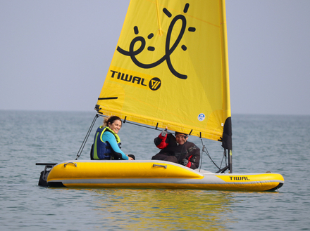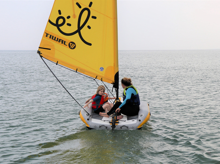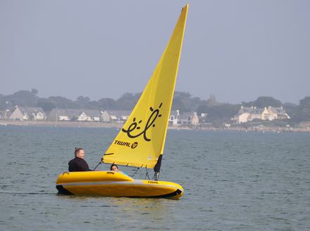 Dans à peine 5 nœuds de vent, petits et grands s’amusent déjà comme des fous. Tout le monde se sent en sécurité sur cette coque vraiment très stable. À cinq ans comme à cinquante on se met debout pour faire rire les amis. Il faut dire que les couches de PVC de très haute qualité, fusionnées et non plus collées pour gagner en poids et en homogénéité, offrent une rigidité bluffante, renforcée par la forme en V et les assemblages. On enchaîne les virements de bord, les empannages, sans risque de se cogner et encore moins de se faire mal. Pas besoin de ramer pour avancer, il suffit de faire gîter et de s’avancer pour limiter la surface mouillée dans ces tout petits airs. En effet, plus le bateau est grand, plus son assiette, aussi bien longitudinale que latérale, est à surveiller. Mais les signaux sont très faciles à décrypter. Dès que la mer commence à passer entre l’aile sous le vent et la coque, il est temps de monter s’installer confortablement au rappel ! Assis sur l’aile, les pieds calés dans la sangle, on peut lâcher les chevaux. Au près, la dérive sabre permet de remonter comme un laser, au portant, la largeur restée à 1,50 m donne de la puissance. À deux, c’est facile, l’un au stick de barre, l’autre à l’écoute de grand-voile, il suffit de se coordonner un peu. Il n’y a que trois bouts à bord, et même finalement seulement deux réglages. En effet, le Cunningham, en dehors des pros de la régate, sert très peu une fois en mer. Mais il sécurise le mât sur la structure alu en cas de dessalage, il ne faut donc surtout pas l’oublier. L’écoute, et à un degré moindre le hale-bas, sont donc les deux seuls réglages à effectuer en mer. À la barre, l’engin se révèle délicieusement sensible. Trop peut-être pour les vrais débutants, à qui il faut apprendre à border d’une seule main sans lâcher la barre. Astucieuse, celle-ci est télescopique, moins longue en équipage qu’en solitaire pour gagner un peu de place à bord. Par bonne brise, une fois confortablement installé au rappel, on peut déployer le stick pour garder le contrôle.