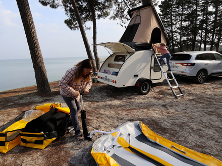 Il faut bien l’avouer, l’arrivée en 2012 de ce véritable OFNI sur un marché du nautisme toujours un brin conservateur a suscité autant de curiosité que de scepticisme. En réalisant deux millions d’euros de chiffre d’affaires sur le dernier exercice, dont 75 % à l’export, la douzaine de salariés de l’entreprise installée près de Vannes ont fait taire les critiques et imposé le respect. Mark Twain avait raison, « ils ne savaient pas que c’était impossible, alors ils l’ont fait ! » Une citation que ne renierait pas Laetitia Picaud, qui découvre en même temps que nous, encore dans ses sacs, le T2L qu’elle vient d’acquérir. Le concept « Dream Big, Pack Small » de Tiwal a complètement séduit cette jeune quarantenaire entrepreneuse. Elle est même venue avec une des caravanes Tear-Drop qu’elle propose à la location à Mesquer, comme pour s’assurer qu’avec son joli voilier ils feront la paire. Bientôt, les clients du campement de La Grande Ourse à Mesquer, à la frontière entre Loire-Atlantique et Morbihan, pourront dormir sous les étoiles et naviguer au soleil. Mais ce premier bateau, elle l’a aussi acheté pour elle, pour partager de bons moments sur l’eau avec ses enfants devenus adolescents, plus aguerris au dériveur qu’elle, la fan de planche à voile. Un peu anxieuse à l’idée de changer de catégorie, elle a été rassurée par la douceur des formes, la légèreté du Tiwal. Elle le sent accessible à tous, sans risque de se blesser, alors pour sa petite famille comme pour le louer ce sera idéal.