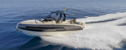 Le GT320S est le quatrième modèle hors-bord (après GT280S, TT280S et GT370S) de l'une des gammes les plus réussies du chantier naval. La demi-étrave inversée caractéristique, signature d'Invictus Yacht, se marie au profil linéaire des grandes fenêtres latérales qui, avec les doubles moteurs hors-bord Yamaha, contribuent à transmettre le caractère dynamique de ce bateau.
