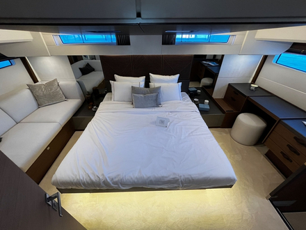 « Le M48, c’est le volume d’un motoryacht de 60 pieds avec la consommation d’un 40 pieds », Erwin Bamps, Directeur Général de Prestige a le sens de la formule à l’heure où la sobriété énergétique est dans toutes les conversations. Mais en découvrant le volume des aménagements proposés par le premier multicoque de la marque du groupe Bénéteau, il est certain que les habitués du monocoque vont devoir revoir leurs ratios de volume / longueur. Cabines, nacelle, flybridge, il y a de l’espace à profusion à tous les étages. L’impétrant a été, c’est certain également scruté par ses concurrents, notamment sa cabine propriétaire avant toute largeur qui est une vraie petite révolution. L’impression d’espace n’est pas feinte sur cette unité de 6 mètres de large. Avec son grand lit central, son sofa sur bâbord, bureau sur tribord, ses multiples rangements et ses deux salles d’eau en contre-bas de seulement deux marches, le terme de suite convient sans doute mieux que celui de cabine.