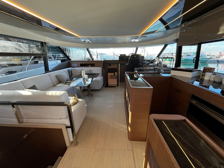 D’autant que cette suite, comme le reste des aménagements, bénéficie du design au luxe discret déjà présent sur les trois autres gammes à succès de la marque, les séries F, X et S. Partout, le niveau de finition tient plus du petit yacht que du multicoque de grande série, mais est bien en ligne avec l’ambition de Prestige qui revendique cet « art de vivre à la française » et veut offrir le maximum de confort de vie à bord quelle que soit la plateforme. Cela doit se traduire par un maximum d’espace et un accès des plus aisé à la mer, deux critères où le multicoque est roi. Sur deux coques, le concept de petite île privée flottante et mobile prend plus que jamais du sens, avec une stabilité qui ne peut que séduire le plus grand nombre. L’immense baie vitrée abolit la frontière entre le cockpit et l’intérieur de la nacelle. Le niveau de confort est aussi élevé dehors que dedans tout comme la vision sur l’extérieur proche de 360° partout. Le carré occupe le côté bâbord, tandis qu’à l’opposé la jolie cuisine en C précède le poste de pilotage intérieur. Les descentes latérales sont asymétriques mais desservent deux cabines VIP aux prestations bien identiques, même si l’on peut opter pour un lit double ou twins, avec leurs salles d’eau attenantes. Quant au flybridge, il est, comme sur tous les motoryachts un endroit important car accueillant une bonne partie de la vie à bord. C’est peut-être là que l’apport d’espace est le moins évident, mais il faut se rappeler que nous ne sommes « que » sur un 48 pieds. Or toutes les fonctions sont bien présentes avec l’incontournable poste de pilotage, la cuisine de jour et le carré en U sont protégés par un bimini rigide quand, à l’arrière, le très grand bain de soleil occupe toute la largeur. Côté technique, le M48 est propulsé par deux moteurs Volvo D4 de 320 CV en V Drive. Le constructeur annonce une consommation de 80 l/h (2 X 40 l.) à 15 Nœuds (Maxi 20 Nœuds). Mais l’avantage du catamaran est qu’il peut naviguer à tous les régimes confortablement, et avec une consommation de carburant qui décroit avec la vitesse, augmentant ainsi l’autonomie.