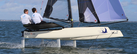 Une année de développement a été nécessaire entre la version école initiale (coques rotomoulées, foils rapportés sur les bordés) et cette version Sport. De l’arrivée sur la plage sur sa remorque de mise à l’eau au premier décollage, il ne s’est pas passé dix minutes. L’équipage à bord est certes aguerri, entre le « pilote d’essai » habituel du chantier et l’un de ses ingénieurs développeurs. Nous observons de l’extérieur, comportement et manœuvres avant de monter à bord. Le vent établi en-dessous de 10 nœuds ne rend pas le bateau très aérien, pas question de voler au près aujourd’hui. Heureusement, travers au vent, une fois le gennaker déroulé, le bateau prend un peu de contre-gîte, puis s’élève doucement avant d’accélérer fort, à l’horizontale ! Vu de l’extérieur cela semble simplissime. D’autant que j’ai bien étudié le plan de pont avant de partir. Une écoute pour le solent auto-vireur, une écoute de Grand-Voile et une écoute de gennaker sur chaque bord, c’est tout ! Il ne reste donc plus à régler que les foils en T des dérives. C’est quand même la clé du vol en mer, un point critique si on veut naviguer avec un minimum des stabilité. Les possibilités de réglages sont importantes et ont un impact direct sur le vol. Il s’agit d’adapter le profil à l’assiette du bateau, à sa gîte, la hauteur de vol, l’état de la mer… autant d‘équations à trop d’inconnues pour qu’un cerveau humain puisse réagir en temps réel deux appendices simultanément. Alors le principe d’un flotteur à chaque étrave, relié par un câble aux foils, a été retenu. Simple et efficace, mais l’on sait combien il est compliqué de faire simple. Alors on peut d’ores et déjà féliciter l’équipe Befoil d’avoir réussi à intégrer un système fiable, et trouvé les bons ajustements pour qu’un béotien du vol monte à bord sans appréhension.