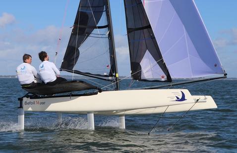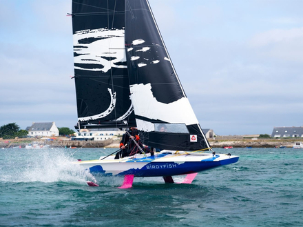 Du côté de Nantes, trois ingénieurs ont fait de leur projet de fin d’études une réalité. Quatre ans seulement après avoir lancé leur start-up de la voile, leur petit dériveur à foils plein d’ambition trace un joli sillage puisque la cinquantième unité vient de sortir de leurs ateliers. Comme les Minis qu’aime dessiner son architecte naval Etienne Bertrand, le BirdyFish a une étrave de scow bien ronde. Fabriquée en sandwich verre-polyester en infusion, elle est insubmersible et pèse 93 Kg. Les foils, de 10 Kg chacun, ont été conçus par un spécialiste en la matière, Jean Baptiste Behm. Leur forme en J leur permet de limiter la largeur du bateau une fois rétractés, mais surtout offre une portance maximale en navigation. L’équilibre entre solidité, effet sustentateur, plan antidérive et souplesse nécessaire pour s’adapter sans réglage à un environnement constamment changeant est un cocktail extrêmement subtil. Le mât est en alu, sans trapèze, accueille un plan de voilure limité à trois voiles, sans même un spi, car aux vitesses atteintes, l’angle du vent apparent n’est jamais très ouvert. « Officiellement », le Birdyfish vole à partir de 12 nœuds de vent. Mais avec un équipage aguerri, il se dit que le bateau décolle dès 8 nœuds. Lors de notre essai devant la plage de La Rochelle, le Birdyfish file très vite à une quinzaine de nœuds dans un vent oscillant entre 10 et 15 nœuds selon les zones. Le BirdyFish navigue à l’horizontale, insensible au clapot, gardant son équipage parfaitement au sec au-dessus des flots, avec pour seul bruit le doux sifflement des foils.